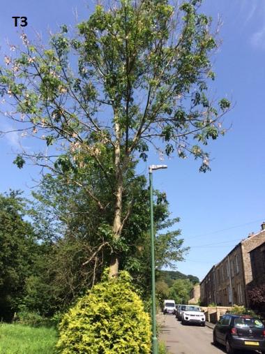Category 3 (T3) - 50-75% dieback - A tree which is clearly diseased - Significantly reduced leaf coverage/crown density. Tips of branches showing die back, brown keys evident and foliage becomes 'clumpy'.